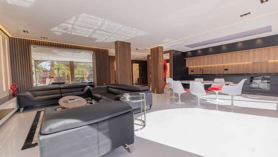 L’espace de réception, sublimé par une luminosité naturelle abondante, dévoile un salon raffiné aux lignes épurées, prolongé par une atmosphère chaleureuse et sophistiquée. La cuisine, entièrement équipée, se distingue par ses finitions haut de gamme et son design résolument contemporain.