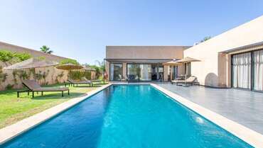 La villa, de plain-pied, offre une terrasse-toiture accessible, offrant une vue panoramique sur la majestueuse chaîne de l'Atlas.